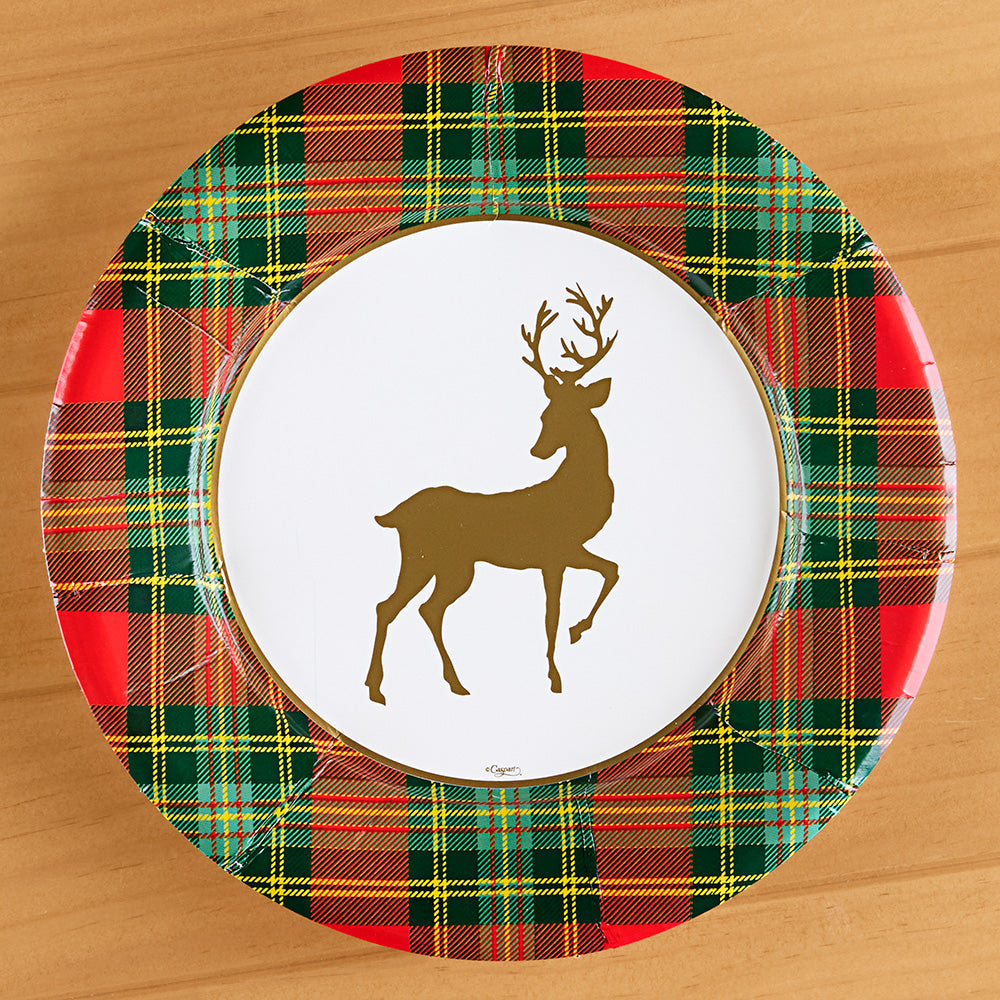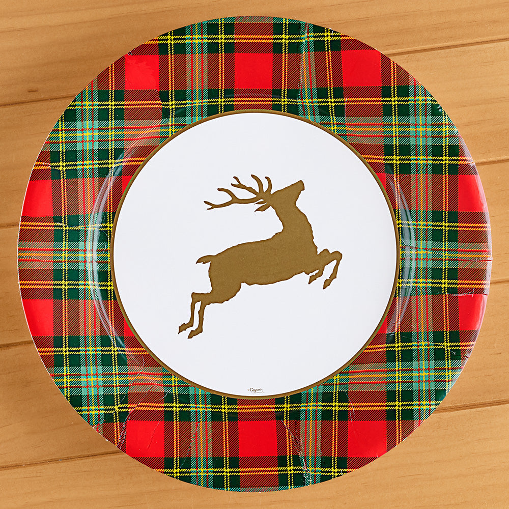 Caspari Paper Plates, Christmas Reindeer on Red Tartan