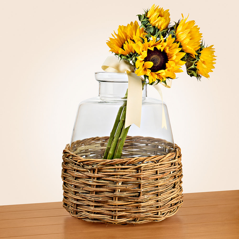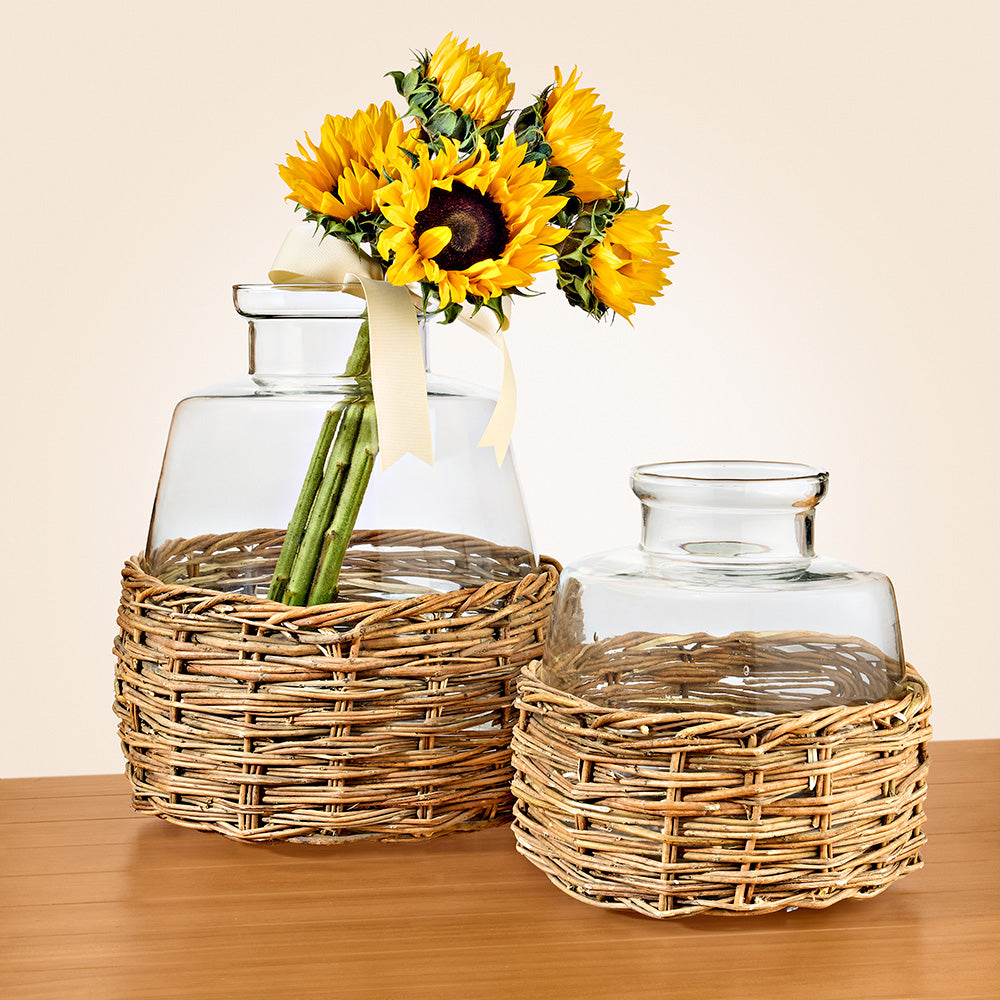 Display beautiful blooms with a hint of rustic charm. This Bottle Vase features an eye-catching combination of smooth glass and woven rattan, creating a natural, elegant accent piece that enhances any space.