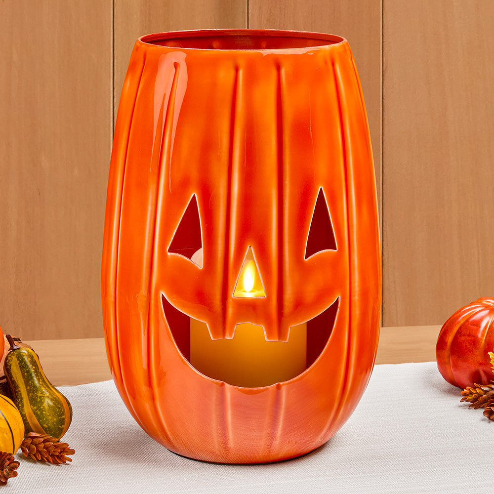 This smiling jack-o-lantern's grin never goes out of style. Its carved cutouts allow light to flicker through, creating a festive, spooky ambiance.