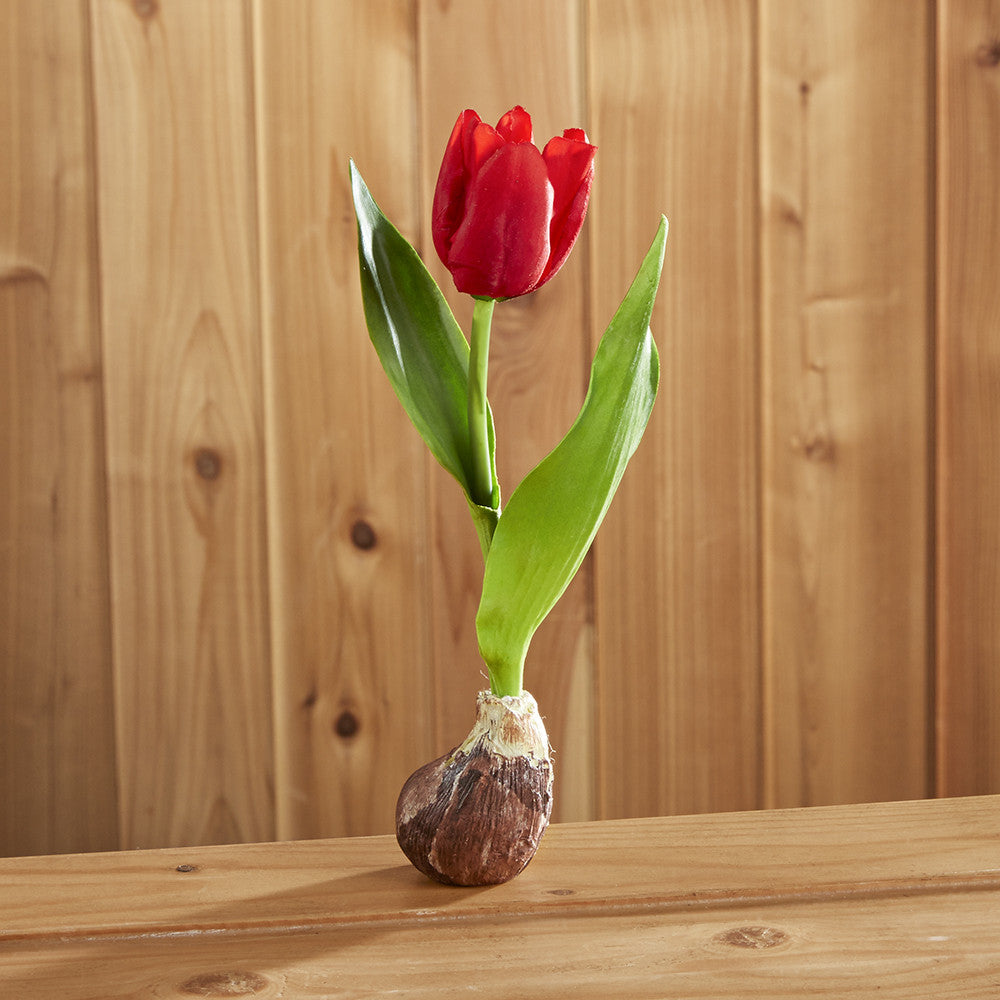 Enjoy this springtime favorite all year! With its lifelike green leaves and gorgeous red petals, this elegant Tulip Bulb brings a vibrant splash of color to your home. Simply pair with one of our stunning vases for an eye-catching display.