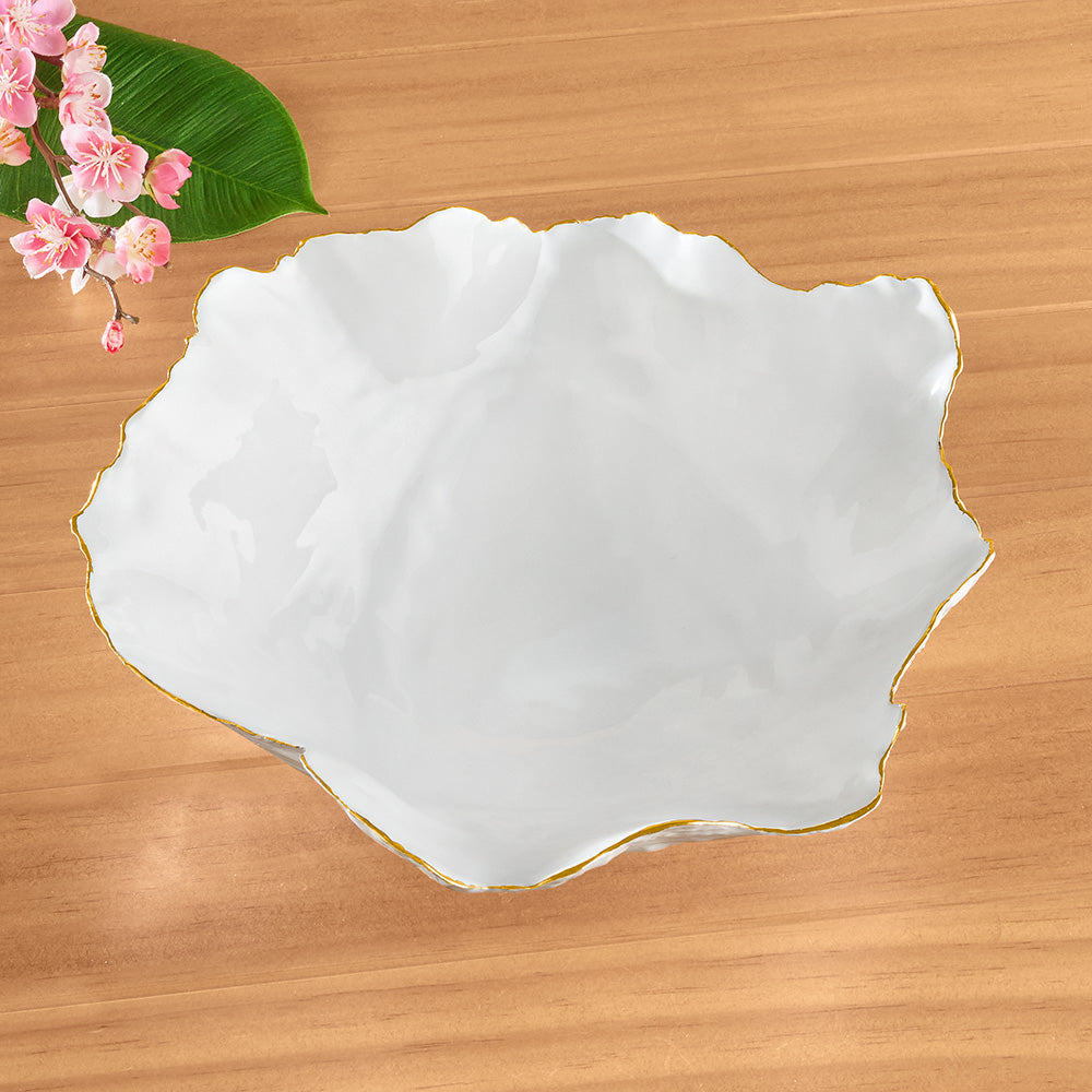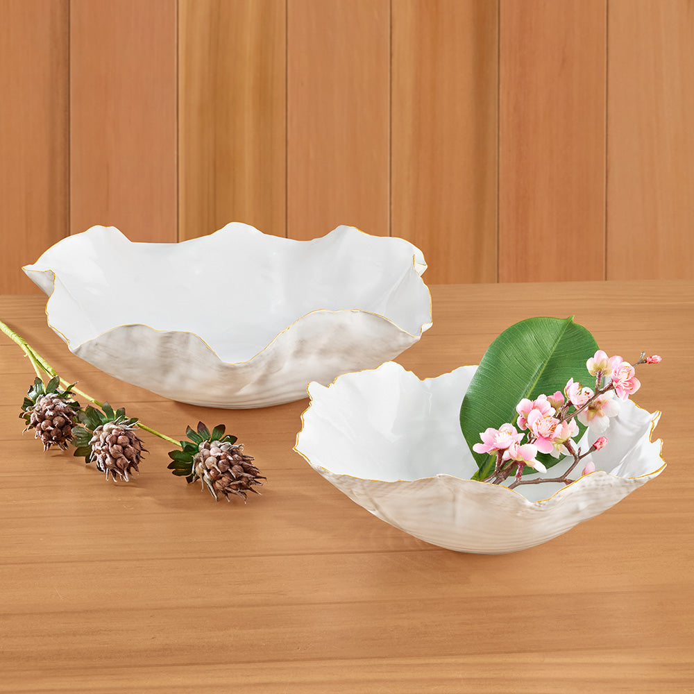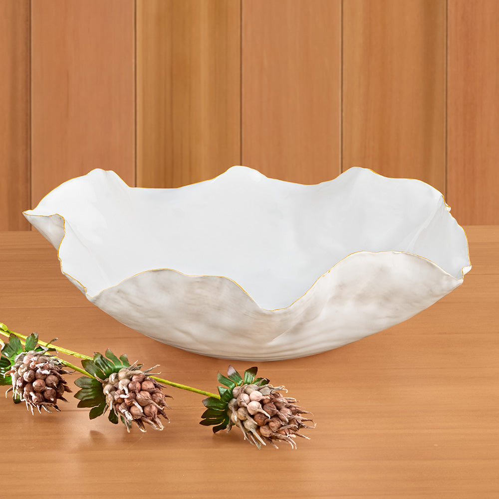 Natural and modern style come together in the Maribella Tray's crimped form, neutral glaze and gilded edges. Add faux florals for a stunning table centerpiece.