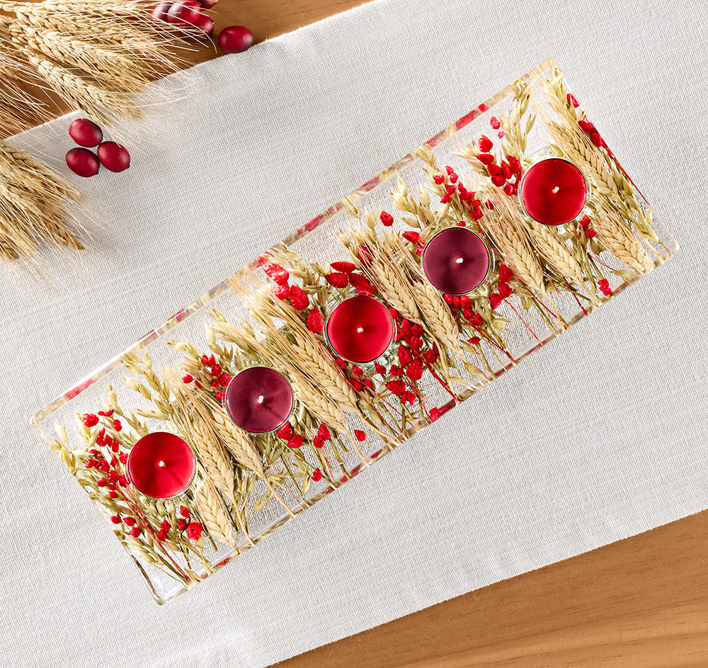 A lovely centerpiece featuring natural ears of wheat and red bellflowers, this Candle Holder captures the essence of Tuscany's wheat fields. It's a beautiful gift for someone special who appreciates nature's elegance.