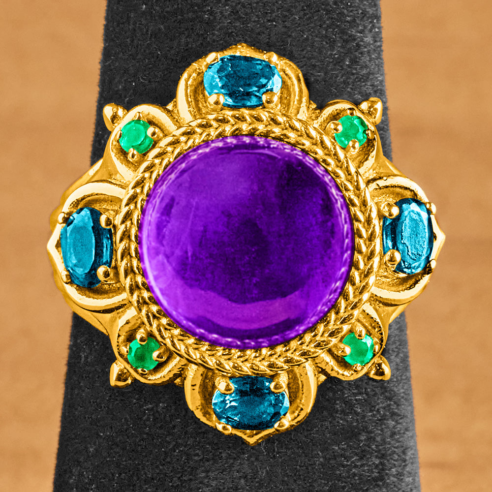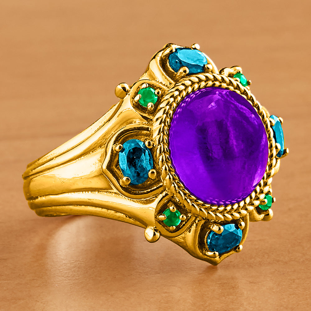 Rumored to possess magical powers, this exquisite ring features a luminous amethyst in a Byzantine-style setting, surrounded by London blue topaz and green onyx. It's regal and gorgeous, just like you.