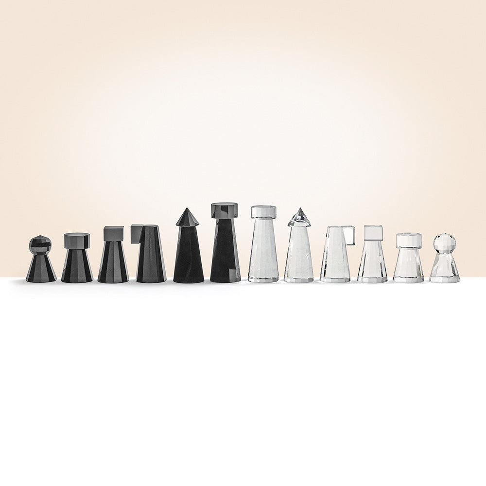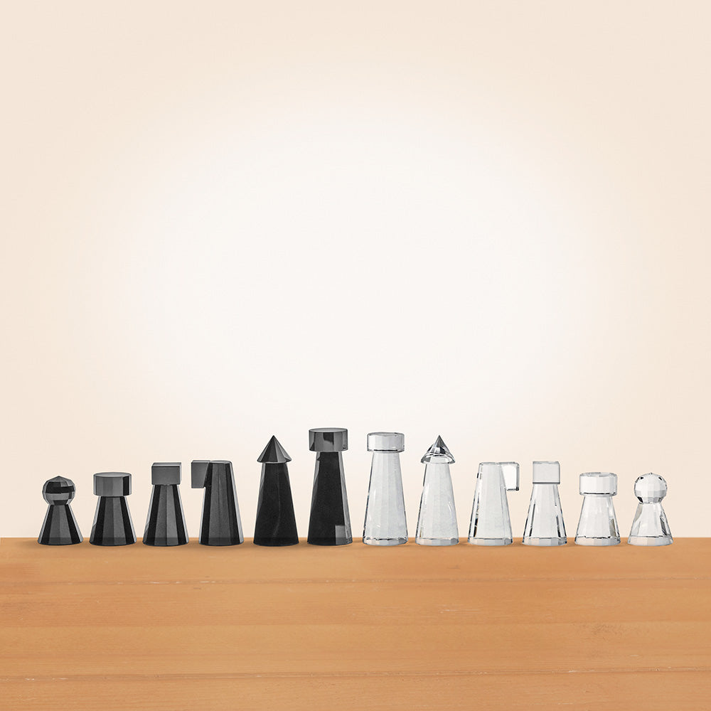 Cut from crystal glass, this luxury Chess Set showcases geometric sculptural pieces atop a clear board that seems to float above the table. It plays as beautifully as it displays, serving as an elegant art object between matches.