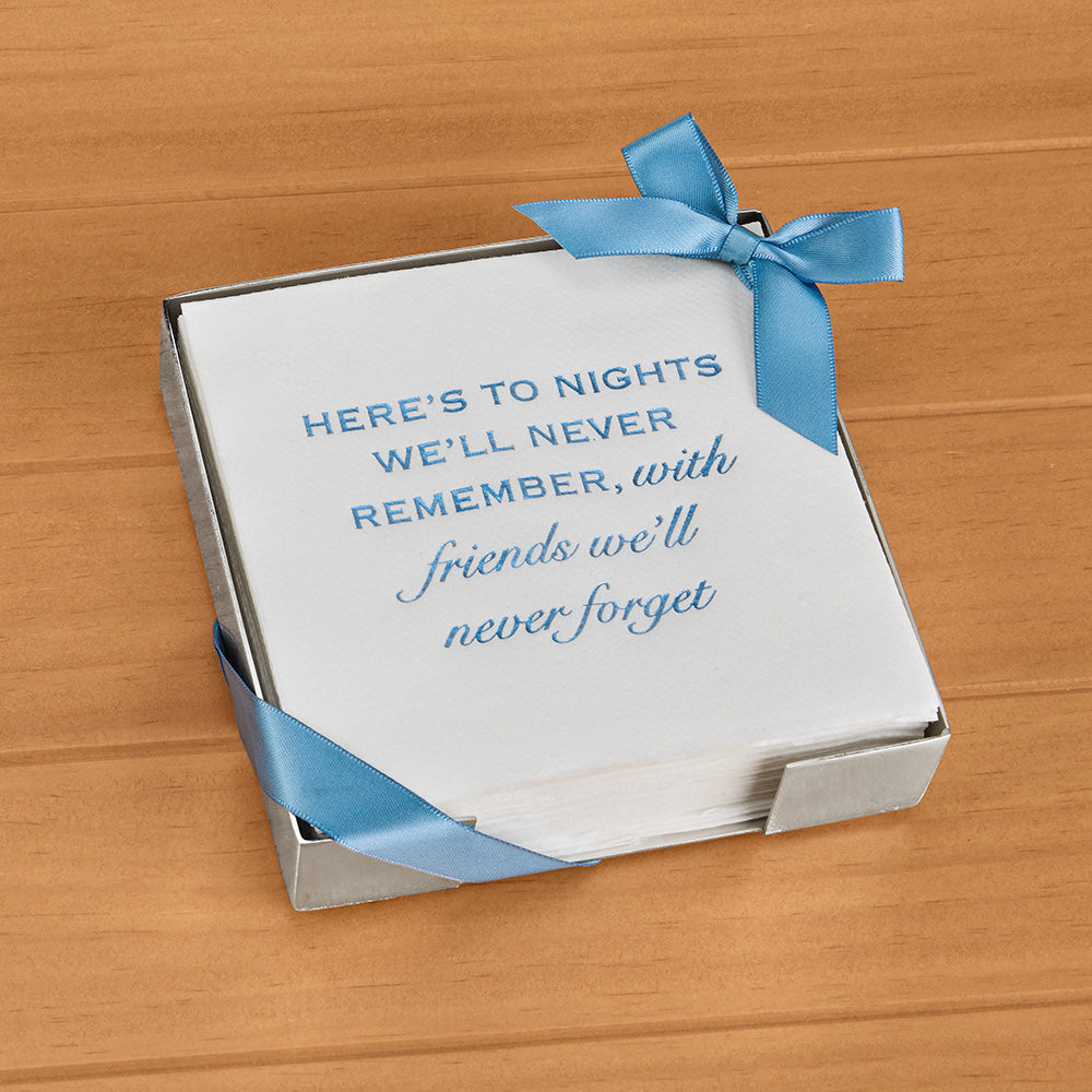 Lined Design Cocktail Napkin and Silver Holder Set, "Friends We'll Never Forget"