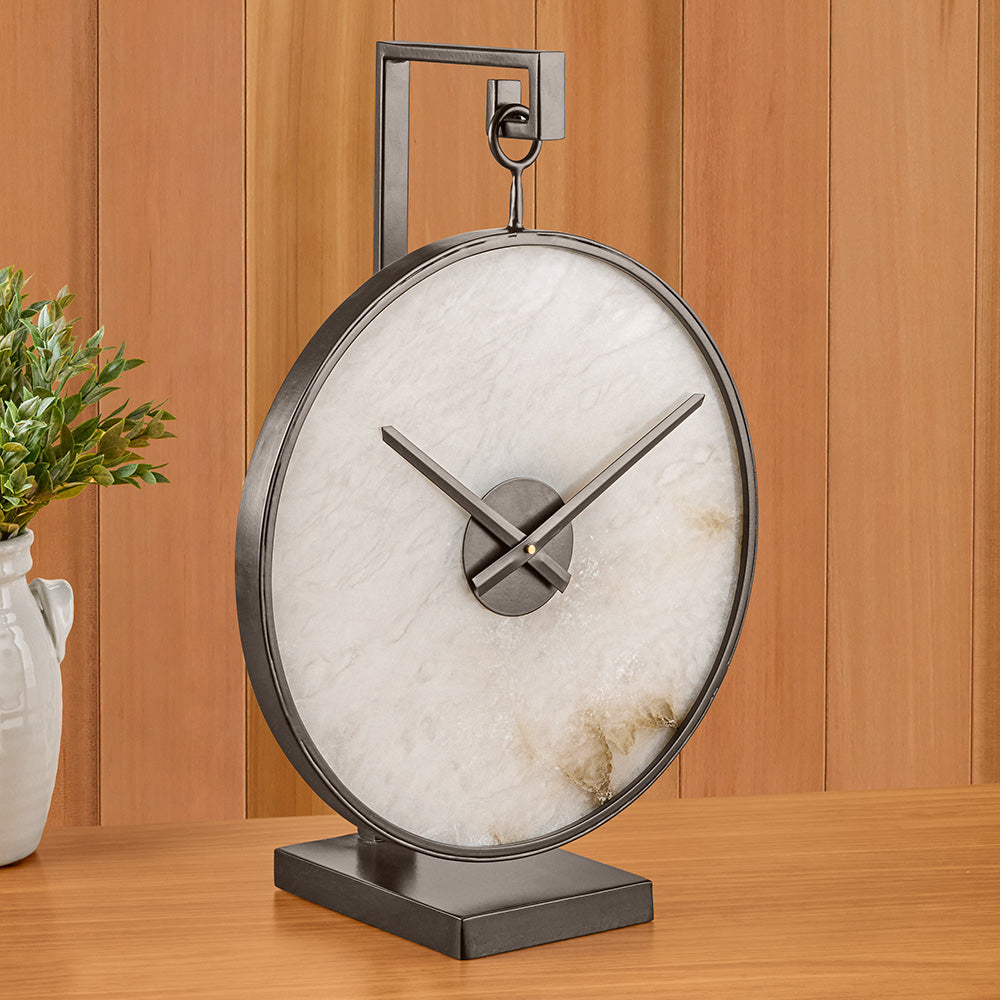 With its ethereal 14.25" stone disk in a bronze frame, the Anya Clock is a regal statement piece. It hangs dramatically – a beautiful display on a table, bookshelf or mantel.