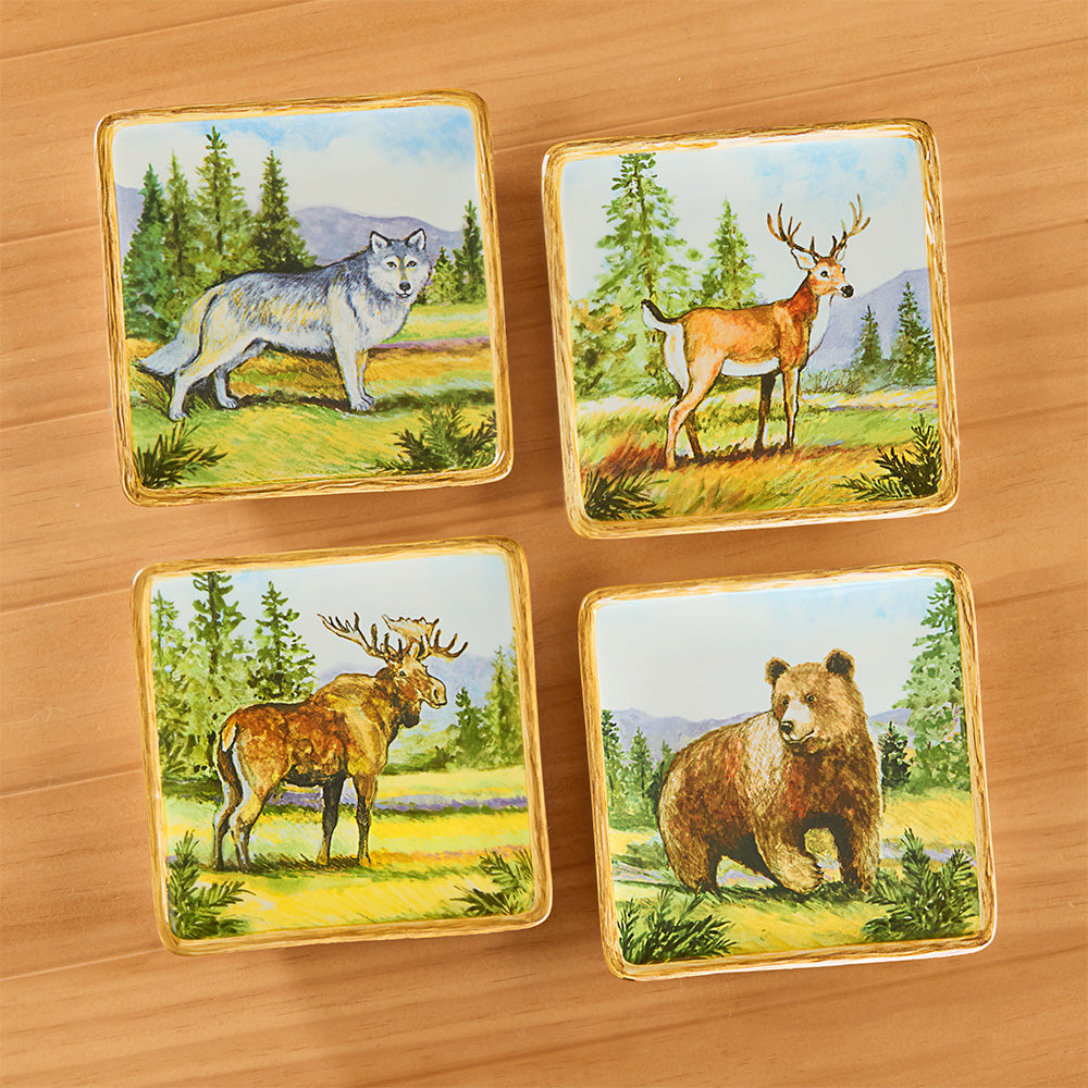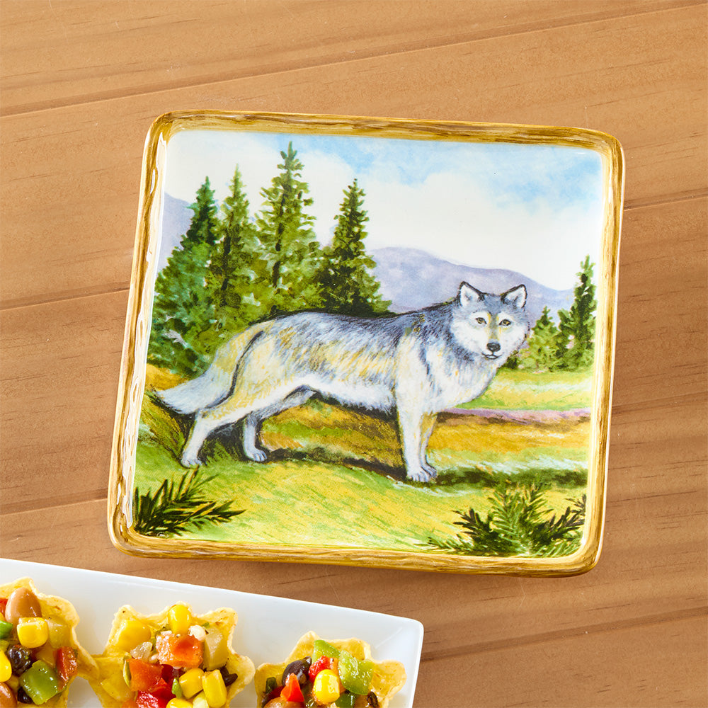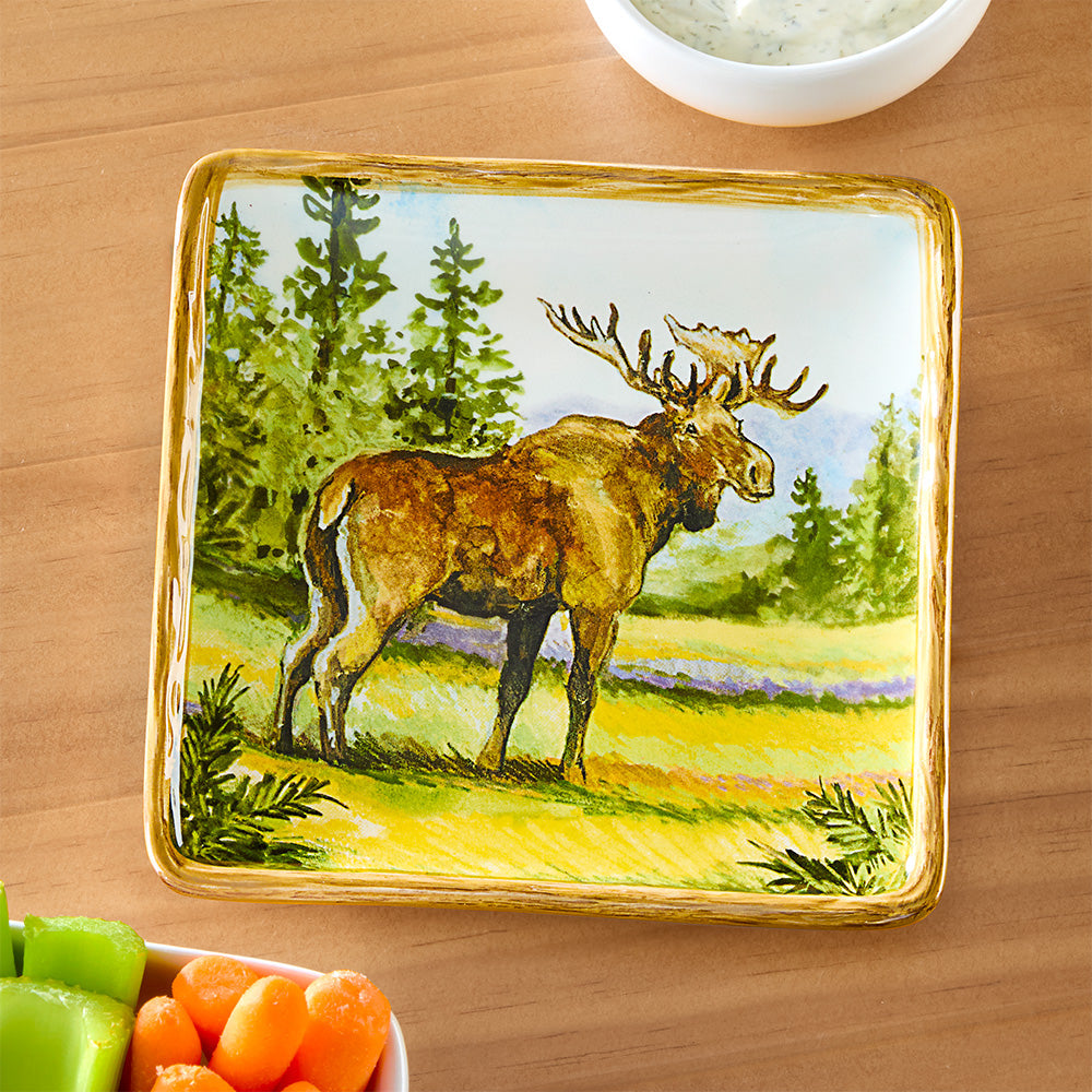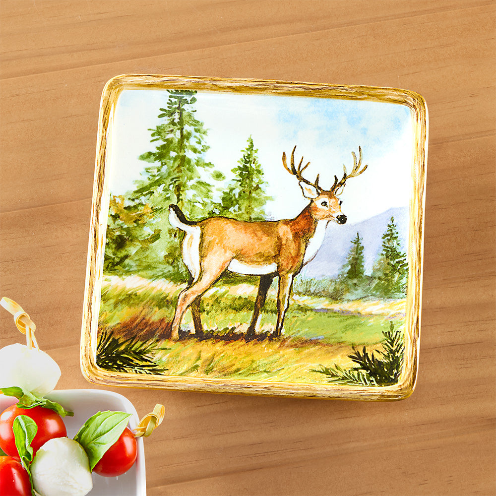 Enjoy appetizers with beautiful scenes of mountain wildlife. A realistic Northwoods image and hand-painted woodgrain rim give this plate rustic style that makes it a standout among hostesses and guests.