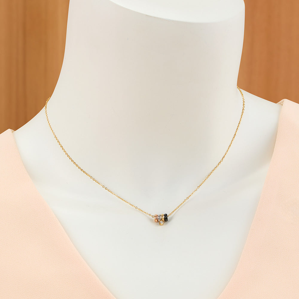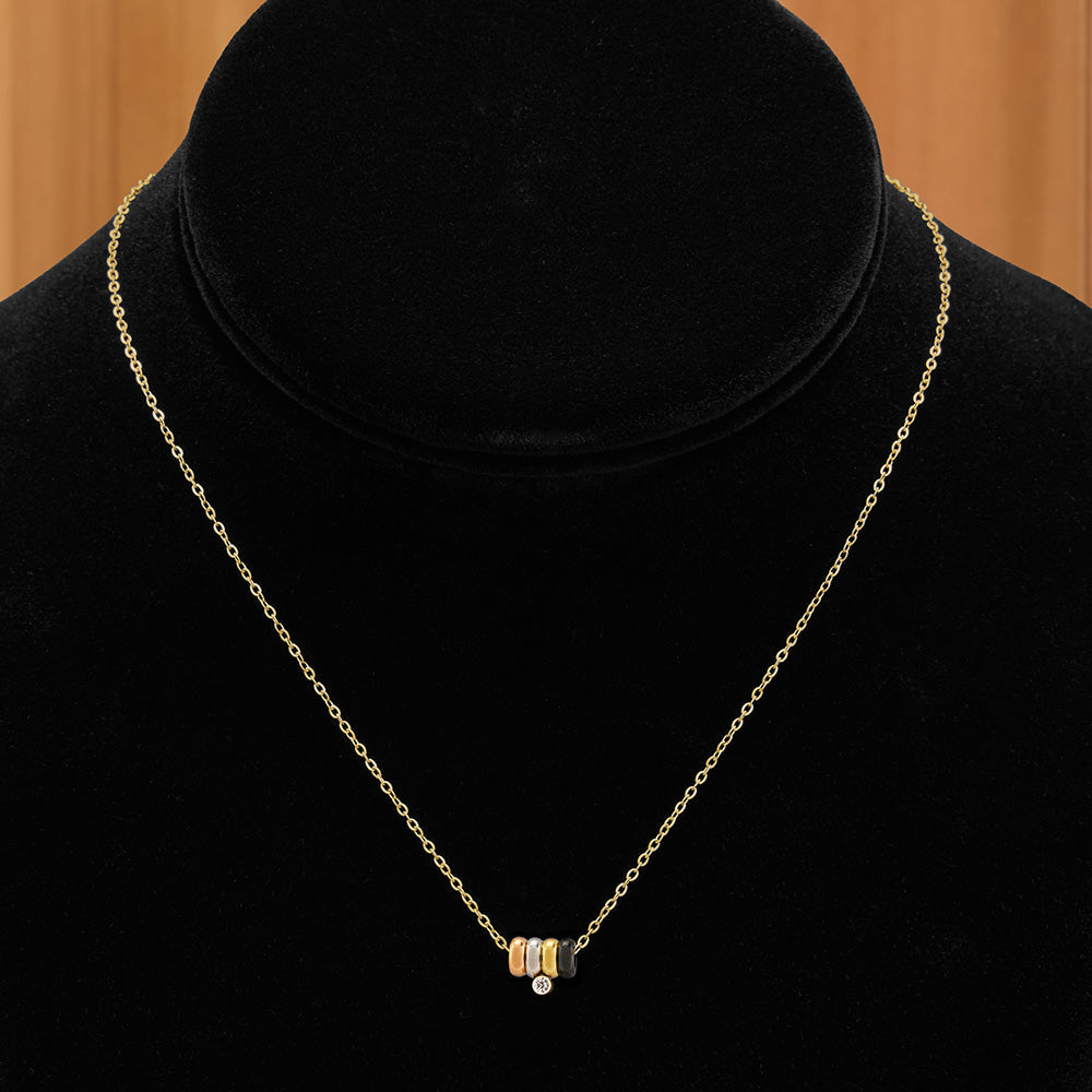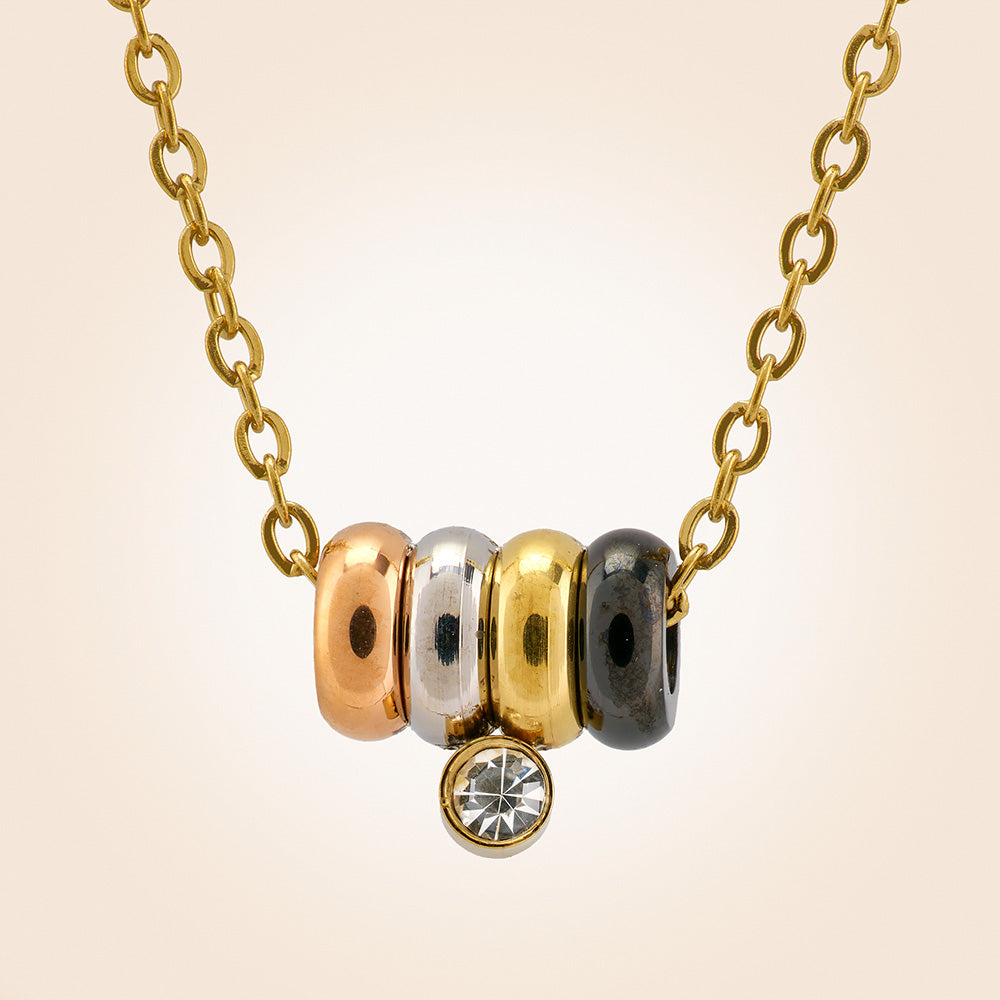 Modern style with a pinch of bling, this versatile necklace will be a new go-to. The metal bead is black, silver, gold and rose gold with a hint of sparkle – a complement to everything in your wardrobe.