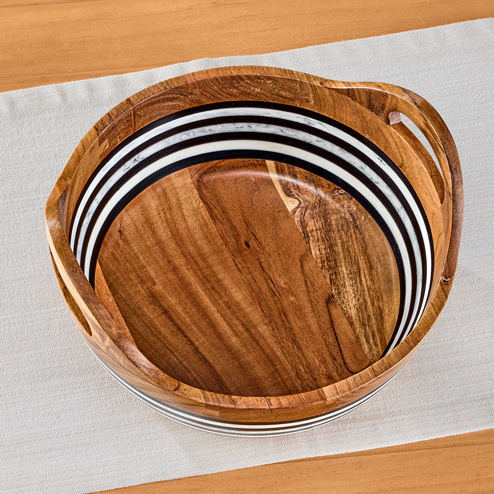 Offer fresh fruit on the kitchen island or serve a garden salad to guests – this bowl combines rustic wood with refined marbled resin for a unique entertaining piece. Easy-to-grip handles make carrying a full load a cinch!