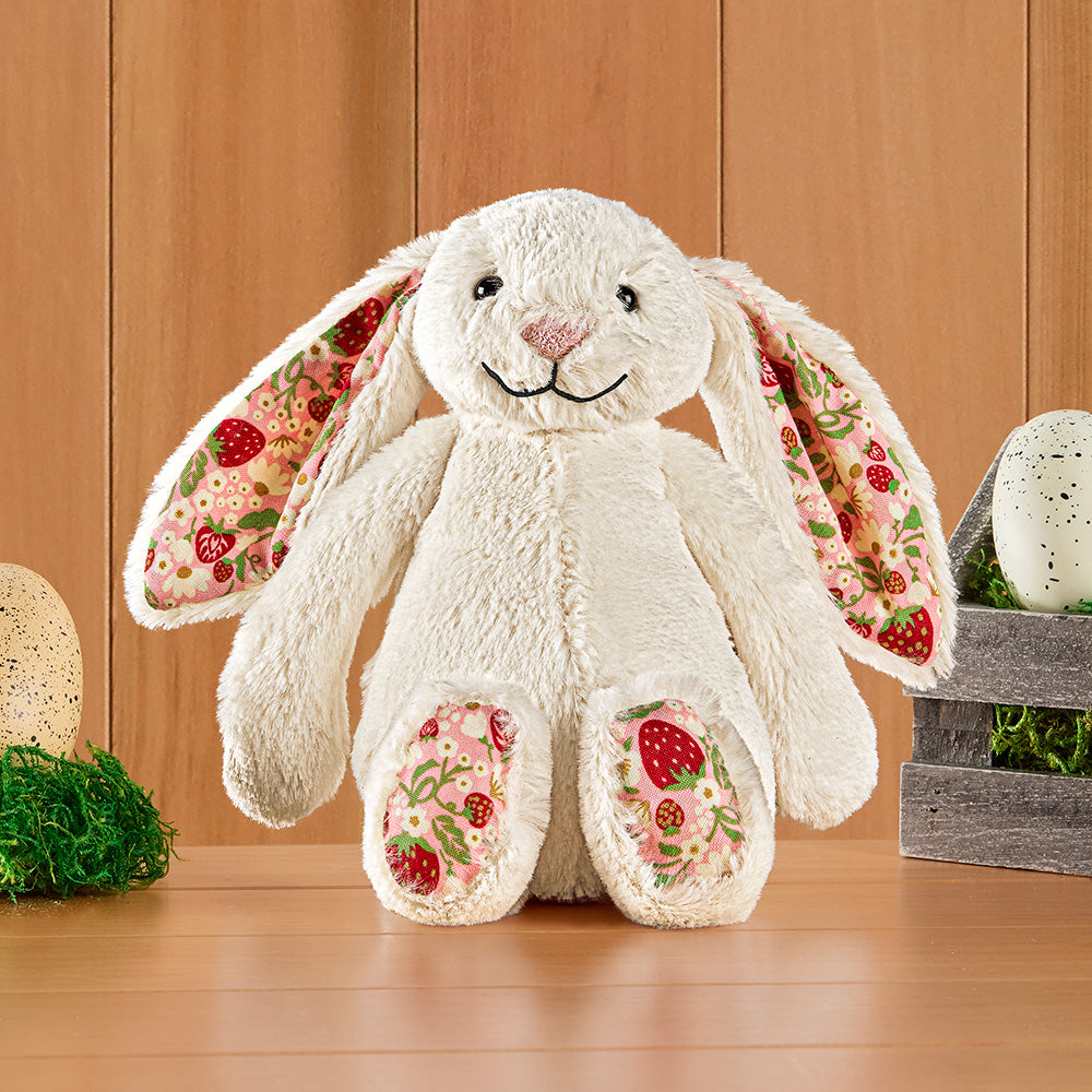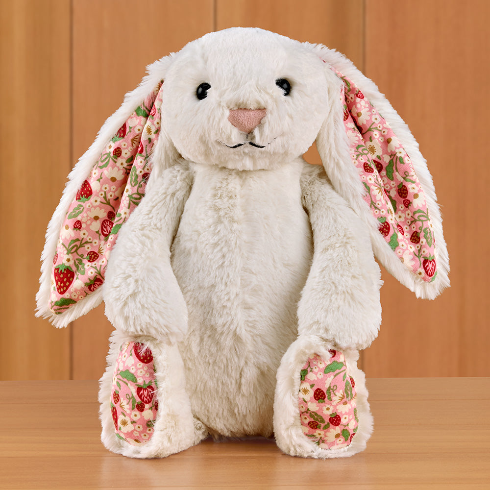 Strawberry Blossom is one berry cute bunny! With soft fur, floppy ears and a super-sweet strawberry print, she makes a beautiful gift for your little one or some-bunny special.