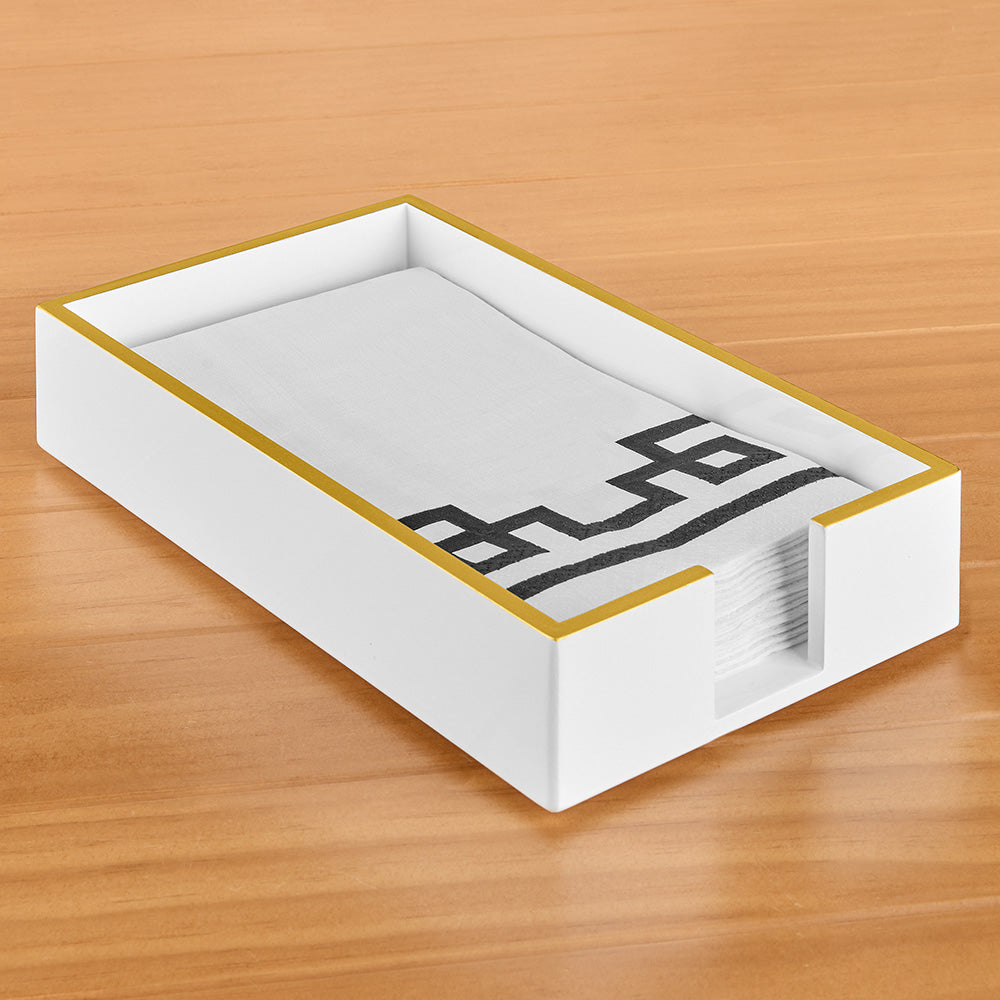 Make napkins easily accessible for grab-and-go table settings, kitchen countertops and bar carts. Elegant and practical, this cream Napkin Holder has a touch of gold for a pinch of panache.